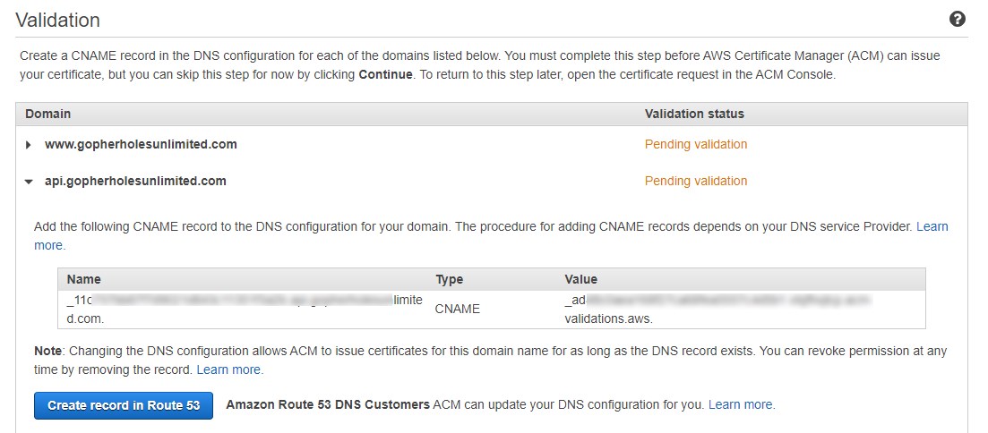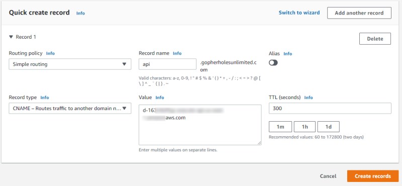 Create a CNAME record with the subdomain we chose in API Gateway - in our case api. For the value, paste in the API Gateway domain name.
