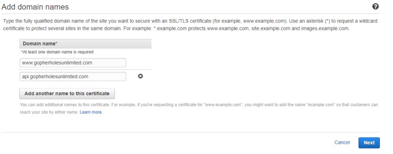 On the Add domain names screen, provide the domain name you just purchased and any subdomains you wish to secure. Tip - if you want to secure all subdomains, you can use an asterisk as a wildcard, *.gopherholesunlimited.com.