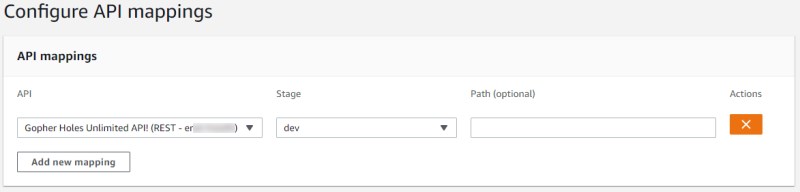 In the details section of the new custom domain, we are going to configure the API mappings. This will allow us to point the custom domain at an existing API Gateway configured in our AWS account.