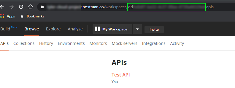 env-apiIds- If you would rather explicitly define which APIs to test, you have the ability to do that as well. Using the same method as above for finding the workspace id, you will navigate to the APIs you which to test in the Postman web app, grab the id from the url, and use it in the environment variable. If you only want to test one API, you can simply put the id into the variable. However, if you want to test more than one API, you have to make it an array by surrounding the ids with square brackets[ ]and double quotes" ".