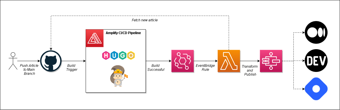 I write articles in markdown and push them to the main branch in my repository. An Amplify build is triggered, which runs Hugo to compile the markdown into HTML then it publishes the content to S3 which is fronted by CloudFront.