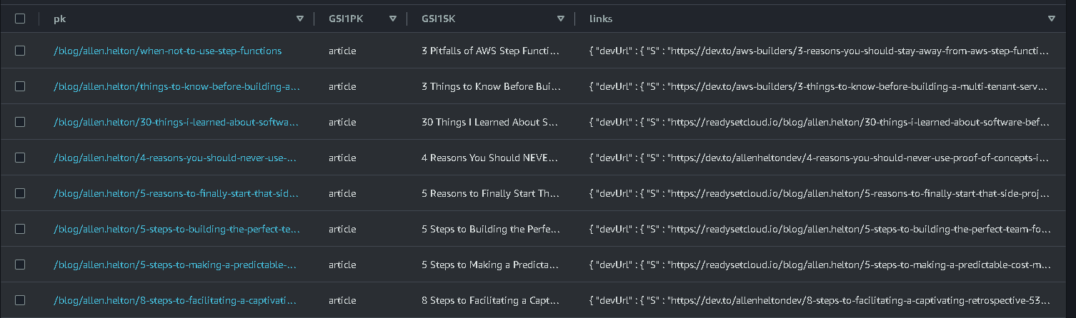 Each article gets a record in DynamoDB that uniquely identifies it by the post slug. The record contains a links object that contains the url to the cross-posted version on Medium, Dev, and Hashnode.