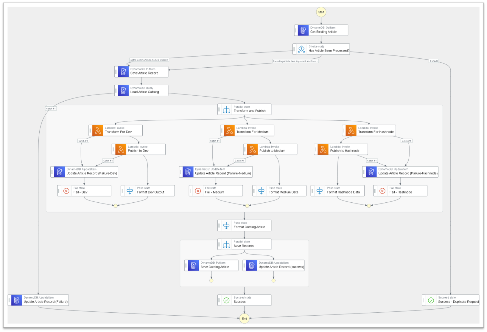 After the idempotency check, it uses a direct integration to DynamoDB to load all the existing articles and their mappings (more on this in a minute). Once the articles are loaded, it transforms and publishes to all three platforms in parallel.