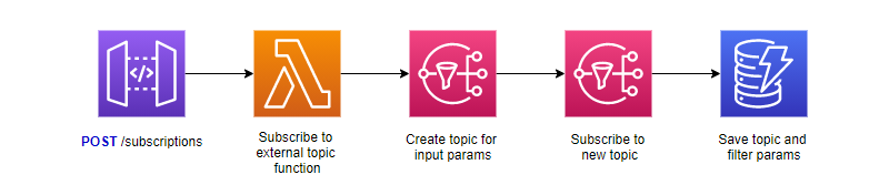 The first time I implemented an architecture to satisfy this scenario, I was unaware of the subscription filter limit. I had come up with a plan where all subscriptions are on the same topic. A filter policy was added to each topic to include tenant, event(s), and other filters.