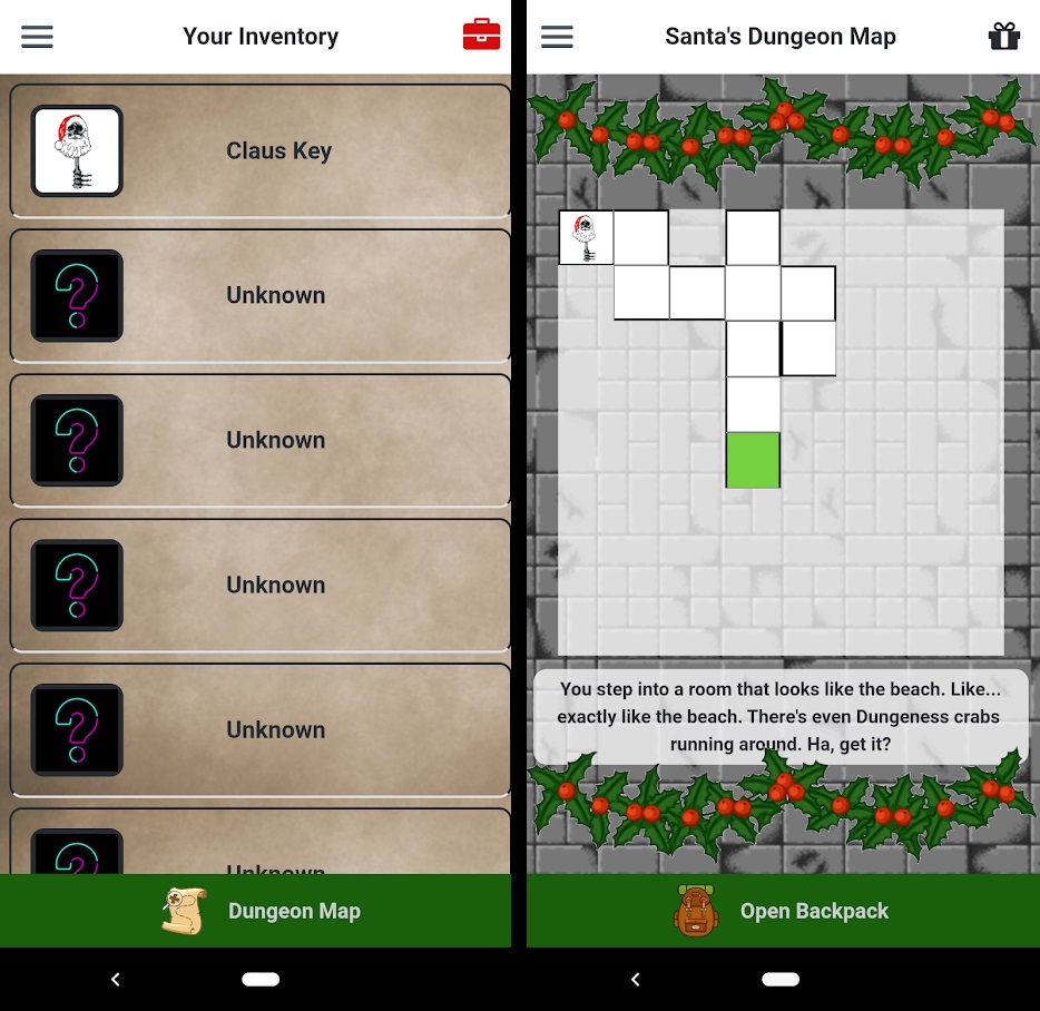 There are two screens in the app: the inventory page and the map page. The inventory page shows him which presents he’s found and their corresponding pictures. The map page shows him the rooms he has explored and where he found certain items.