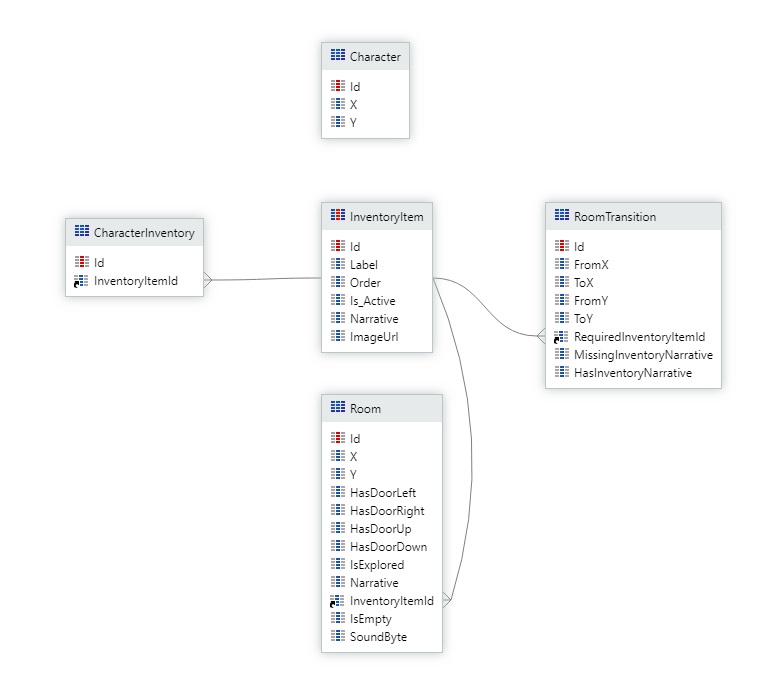 Behind the scenes we have the data model below that builds the map, story, christmas present inventory, and room transitions.