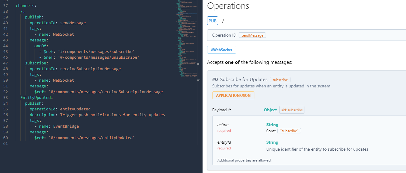However, Async API Spec was designed to do just that. It documents the events that drive behavior and illustrates the publish and subscribe interactions a user can take on our WebSocket.