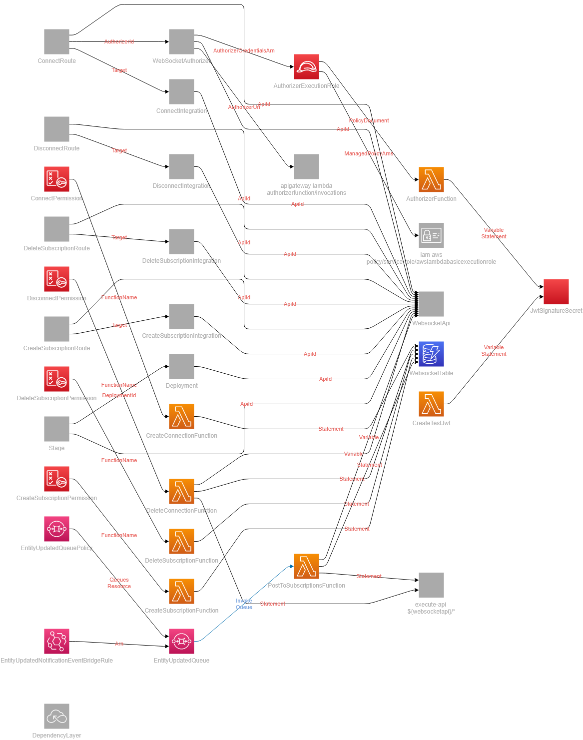 Included in the repository is a complete infrastructure diagram generated from the template.yaml file. If you don’t already include it as a common practice, I highly recommend generated diagrams. They take no effort and provide a tremendous value. Below is the full set of resources deployed into AWS to build a secure WebSocket API.