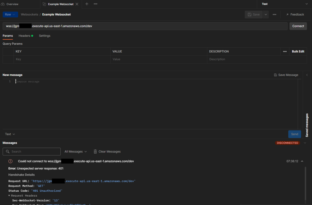 With everything deployed, it’s time to connect to our WebSocket! First, we need to verify the connection is secure. So we will try to connect to it like we did in part one of the series.