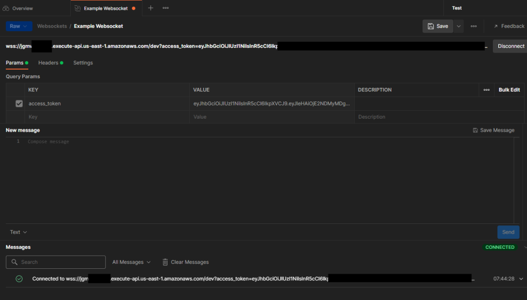 Now that we are connected, we can send and receive messages to the WebSocket without the need for additional auth.