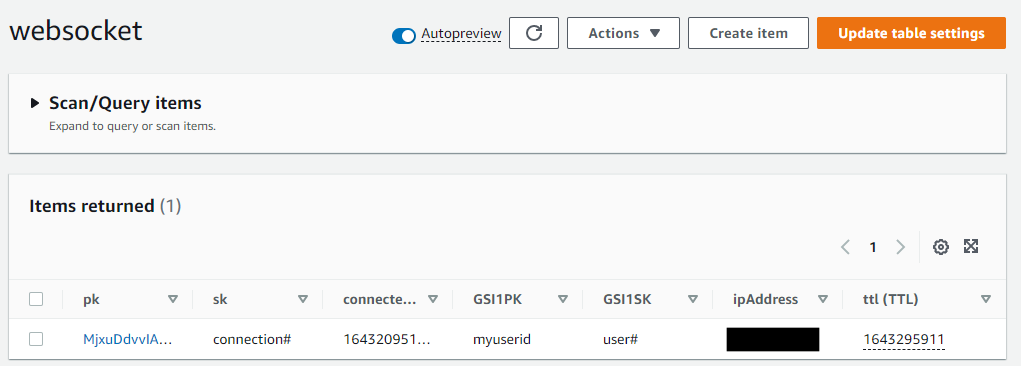 The user id is stored as the GSI1PK so we can look up connection information for a user and send them a push if we need to. This functionality is not implemented in this walk through, but we will expand on that in a future article in this series.