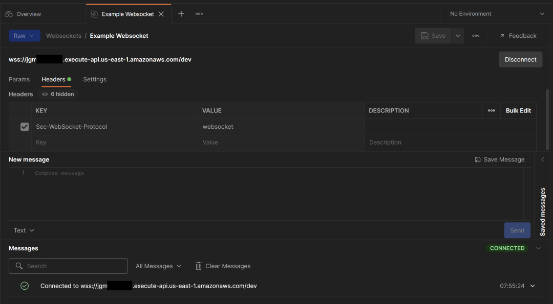 In order to test your WebSocket, you can grab the WebsocketUri output from your SAM deployment and connect to it in Postman. Postman is an application designed for everything around APIs, including connecting to WebSockets.