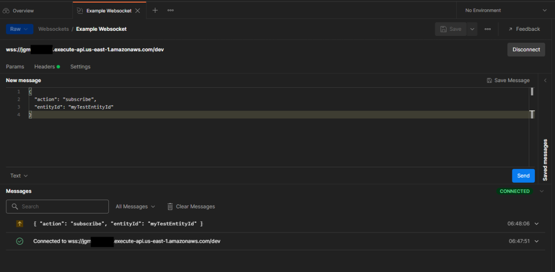 Now that we’re connected to the WebSocket, add this message to Postman and hit the Send button. It will hit the endpoint and save the subscription.