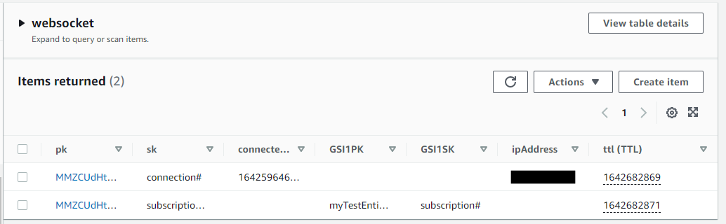 The first thing we want to do is take a look at DynamoDB and verify our connection and subscription were saved. If you navigate to the websocket table in the DynamoDB console you will see there are two entries present: a connection entry and a subscription entry.