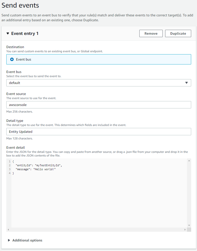 To manually send the event, click the Send Events button in the EventBridge console and add the following details as described in this screenshot