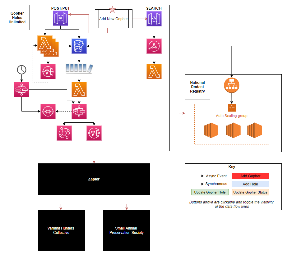 - Architecture Diagram Lite - Shows the types of architectures at play. Gopher Holes Unlimited is a serverless application, the National Rodent Registry is a containerized auto-scaling ec2 app, etc…