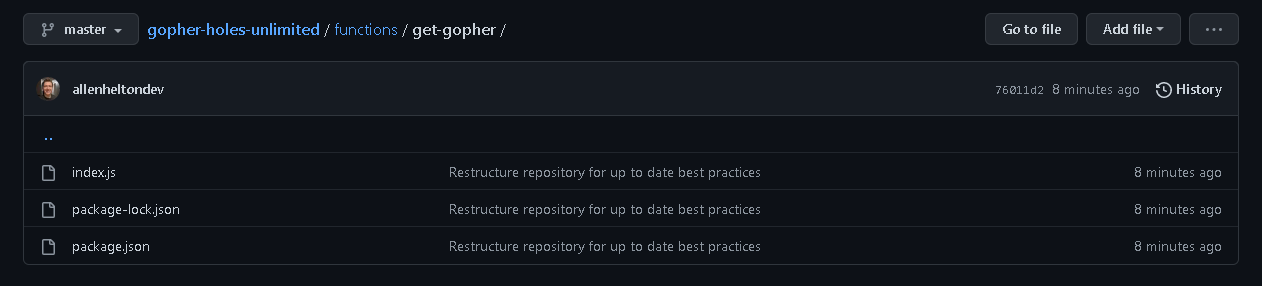 Take the above folder for the get-gopher Lambda function as an example. It contains an index.js, package.json, and package-lock.json. This means each function can have completely isolated dependencies, allowing you to reduce your Lambda package size which ultimately reduces cold start time.