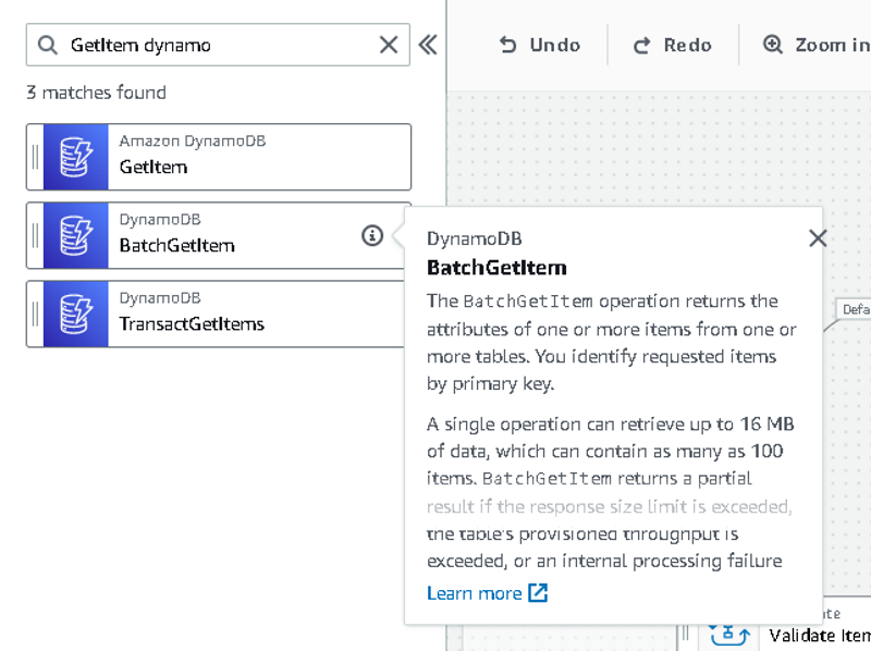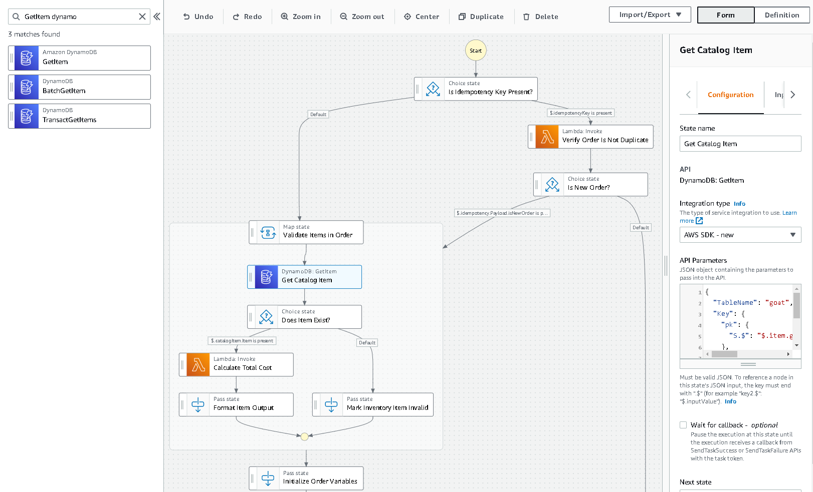 The builder allows me to drag and drop states on the screen so I can visually see the workflow of my data. I search in the filter for the SDK integration I want to use, like a DynamoDB GetItem call, and move it to the appropriate spot in the workflow.