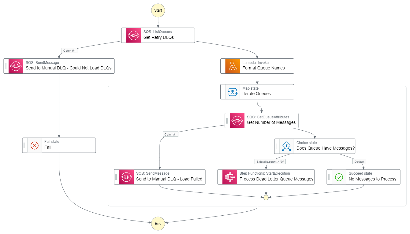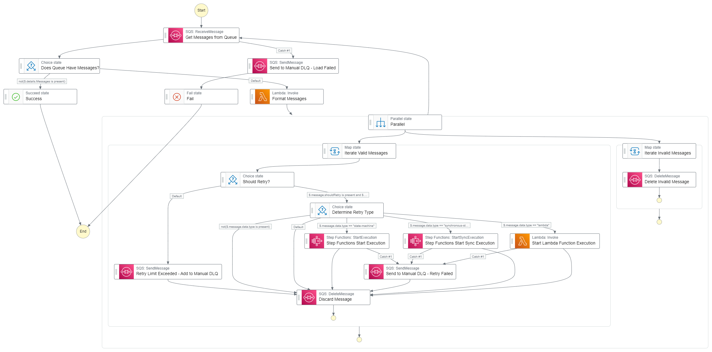 Cons - This state machine needs wildcard access to SQS queues, Lambda functions, and state machines. Now, it doesn’t need full admin, but it does need to read and delete messages and invoke state machines and functions. This does not follow the principle of least privilege and opens doors wider than they should be. You also don’t get the benefit of adding business logic and transformations upon retry. Lastly, you could get yourself into an infinite loop here as well if you have a bug in your max attempt logic.